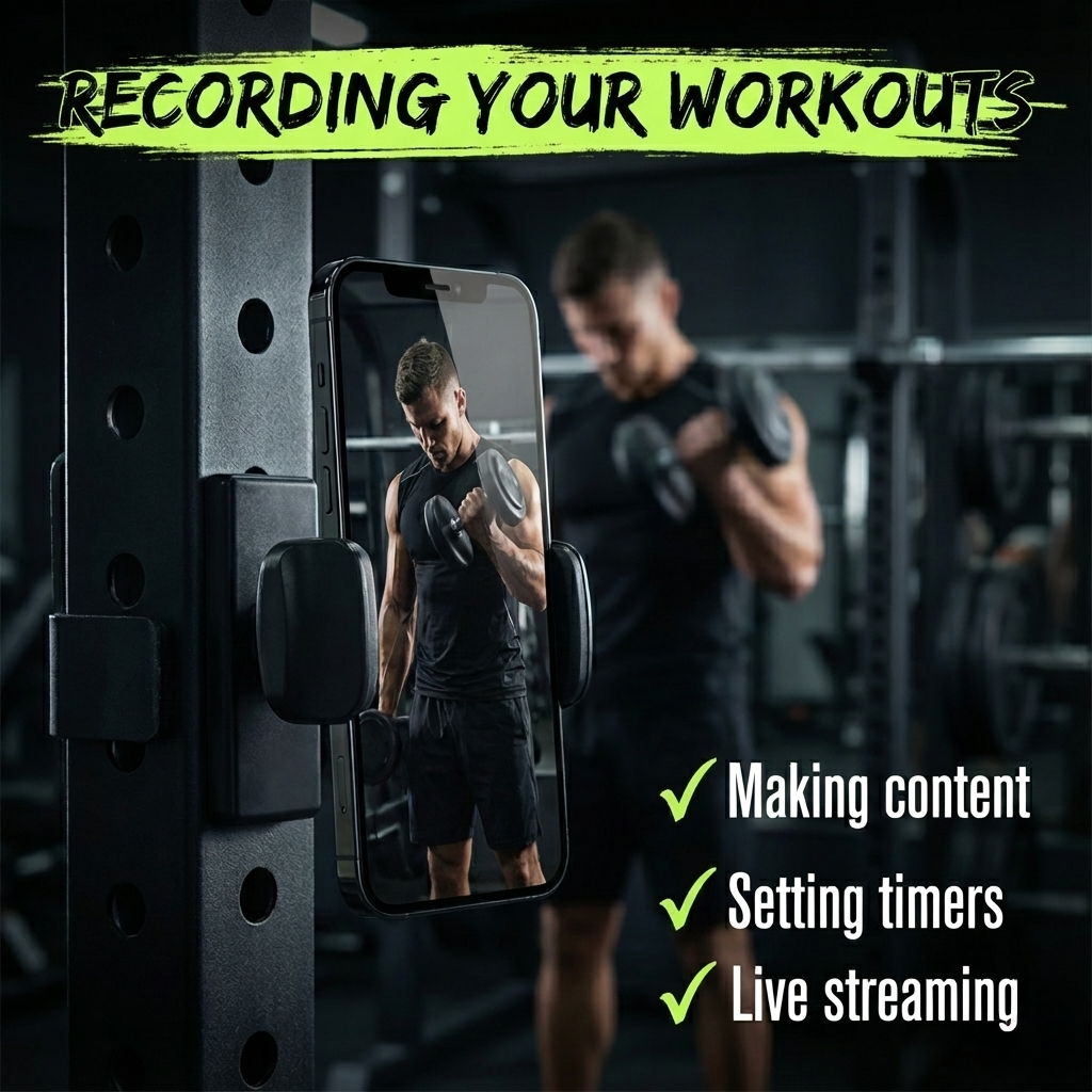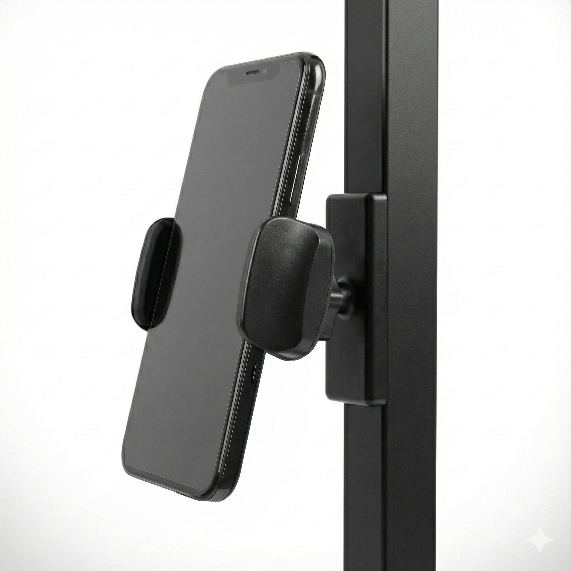 A heavy-duty magnetic gym phone holder designed to attach securely to metal gym equipment. Features a wide adjustable clamp to hold any smartphone firmly, plus a 360° rotating joint for perfect viewing angles during workouts.